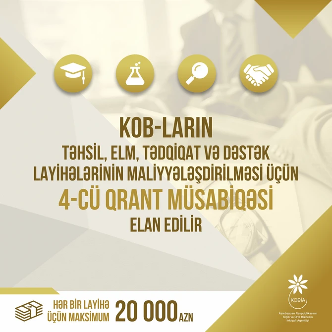 İqtisadiyyat Nazirliyinin tabeliyindəki Kiçik və Orta Biznesin İnkişafı Agentliyi (KOBİA) təhsil, elm, tədqiqat və dəstək sahələri üzrə layihələrin maliyyələşdirilməsi məqsədilə 4-cü qrant müsabiqəsi elan edib.