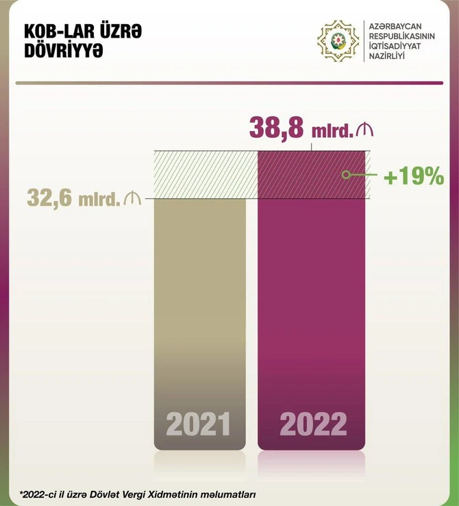 M.Cabbarov bildirib ki, hesabat dövründə KOB-lar üzrə dövriyyə isə 2021-ci illə müqayisədə 19 % artaraq 38,8 milyard manata çatıb.