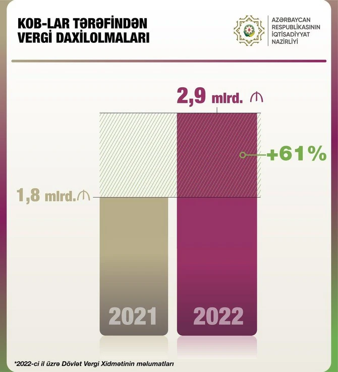 Ötən il Azərbaycanda kiçik və orta biznes subyektləri üzrə vergi daxilolmaları 2021-ci illə müqayisədə 61 % artaraq 2,9 milyard manata çatıb.
