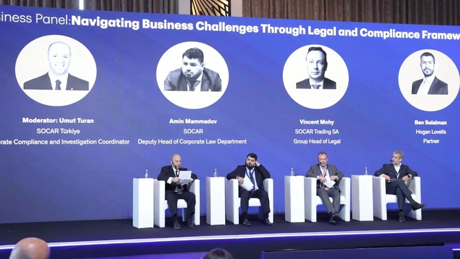 Hüquq və Uyğunluq Forumu çərçivəsində "Beynəlxalq arbitraj mübahisələri", "Korrupsiya və qlobal enerji sektoru", "Biznes mühitində hüquqi çətinliklər" mövzularında panel müzakirələri aparılıb.