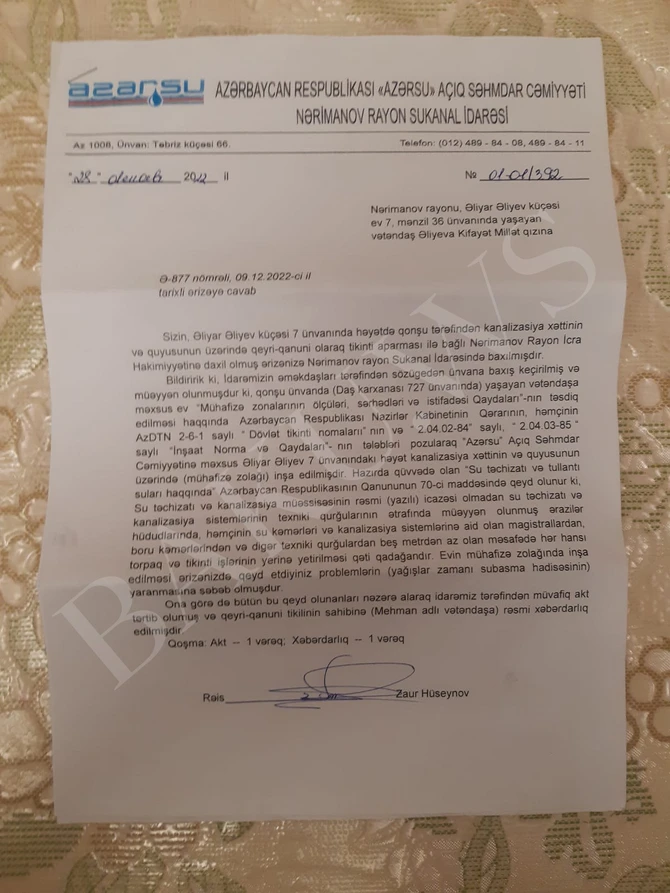 Şikayətçinin sözlərinə görə, sakinlər bu barədə "Azərsu” ASC-yə şikayət edib. Müvafiq qrumun əməkdaşları əraziyə baxış keçirib və həqiqətən də həmin tikilinin qanunsuz olmasını, su quyusunun üzərində tikilməsi faktını təsdiq edib. Lakin tikilinin sahibi, "Mənim icradan icazəm var", - deyərək heç bir tədbir görmür.