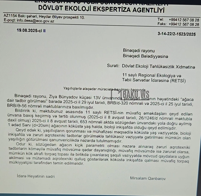 Məhəllə sakinlərinin dediyinə görə, hadisə baş verdikdən dərhal sonra bütün aidiyyəti qurumlara, o cümlədən Ekologiya və Təbii Sərvətlər Nazirliyinə, Binəqədi Bələdiyyəsinə və Bakı Şəhər Yaşıllaşdırma Təsərrüfatı Birliyinə dəfələrlə yazılı və şifahi müraciətlər edilib. Nazirlik tərəfindən ağacın bərpasına dair rəy də verilib. Binəqədi Bələdiyyəsi məsələni aidiyyəti üzrə Yaşıllaşdırma İdarəsinə yönləndirib. Ancaq problem hələ də öz həllini tapmayıb.