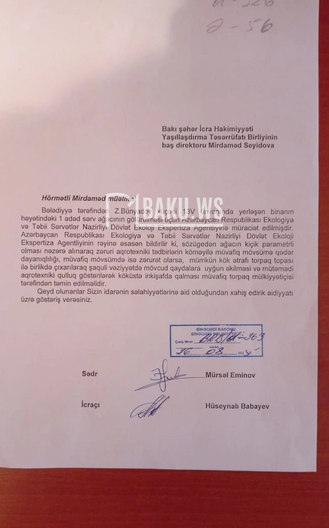 Bu ilin aprel ayında Bakıda əsən güclü külək nəticəsində Ziya Bünyadov prospekti, ev 13V ünvanının qarşısında yerləşən sərv ağacı ciddi zədələnərək qəzalı vəziyyətə düşüb. O gündən bu günə qədər, düz 6 aydır ki, yerli sakinlər təhlükə ilə üz-üzə yaşamağa məcbur qalıblar.