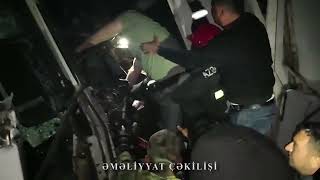 Hadisə yerində əməliyyat şəraiti qiymətləndirilərkən müəyyən olunub ki, “Kamaz” markalı yük avtomobili ilə “DAF” markalı tranzit yük avtomobilinin toqquşması nəticəsində yol-qəza hadisəsi baş verib və sürücü deformasiyaya uğramış “DAF” markalı avtomobildə sıxılı vəziyyətdə qalıb.