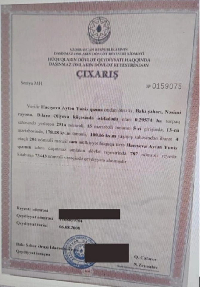 Həmin binanın 13-cü mərtəbəsində G.Hacıbəyliyə xüsusi "xidmətlərinə" görə, "boz kardinal" tərəfindən bağışlanan digər mənzil isə Gültəkinin bacısı Aytən Hacıyevanın adına rəsmiləşdirilib. 178.18 kv.m sahəsi olan, 4 otaqlı mənzildə isə G.Hacıbəyli özü tək yaşayır.