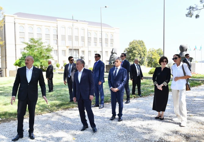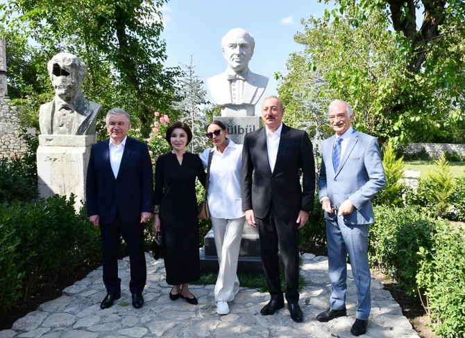 Sonra Azərbaycan Prezidenti İlham Əliyev, birinci xanım Mehriban Əliyeva və Özbəkistan Prezidenti Şavkat Mirziyoyev, xanımı Ziroatxon Mirziyoyeva Azərbaycanın tanınmış şəxsiyyətləri Natəvan, Bülbül və Üzeyir Hacıbəylinin işğal dövründə Şuşada ermənilər tərəfindən gülləbaran edilmiş heykəllərinə baxıblar.