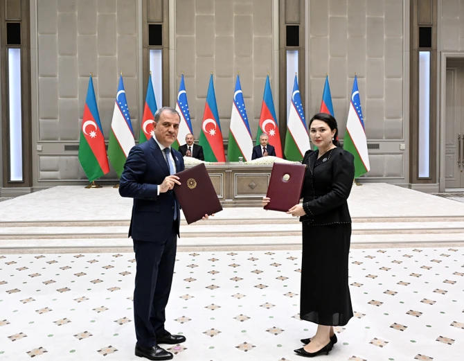 “Azərbaycan Respublikası Ədliyyə Nazirliyinin Ədliyyə Akademiyası ilə Özbəkistan Respublikasının Ədliyyə Nazirliyinin yanında Hüquqşünasların İxtisasının Artırılması Mərkəzi arasında əməkdaşlıq haqqında Protokol”u Azərbaycan Respublikasının xarici işlər naziri Ceyhun Bayramov və Özbəkistan Respublikasının ədliyyə naziri Akbar Taşkulov imzaladılar.