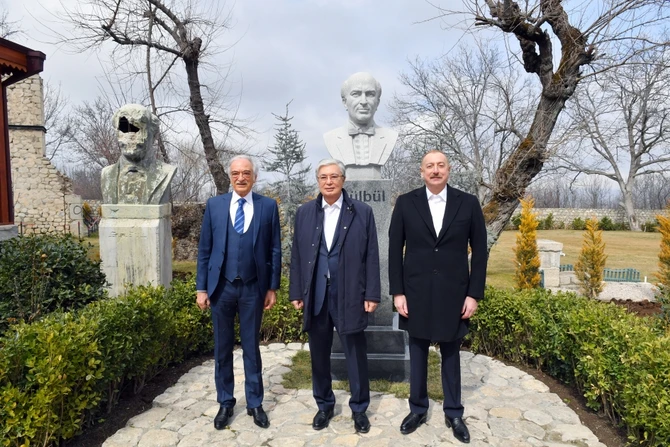 Dövlət başçıları Azərbaycanın tanınmış şəxsiyyətləri Natəvanın, Bülbülün və Üzeyir Hacıbəylinin işğal dövründə Şuşada ermənilər tərəfindən gülləbaran edilmiş heykəllərinə baxdılar.
