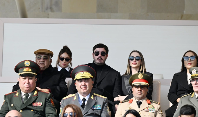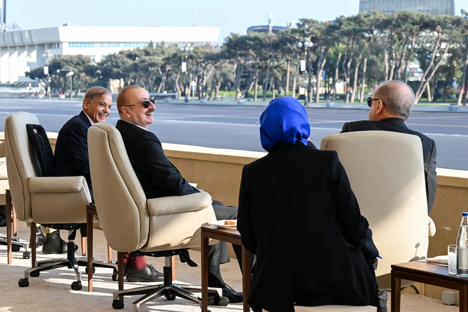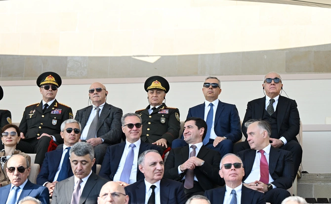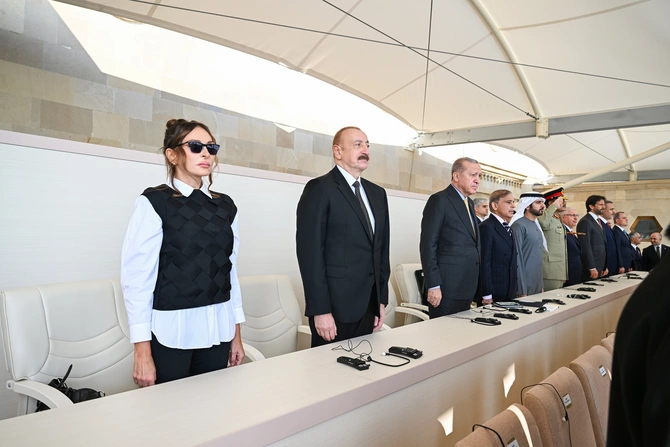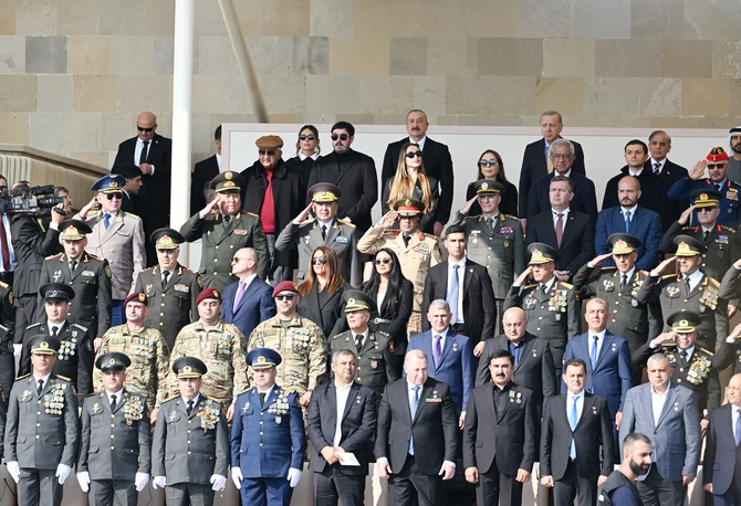 BAKU.WS xəbər verir ki, Azərbaycan Respublikasının Prezidenti İlham Əliyev, birinci xanım Mehriban Əliyeva, Türkiyə Respublikasının Prezidenti Rəcəb Tayyib Ərdoğan, Pakistan İslam Respublikasının Baş naziri Məhəmməd Şahbaz Şərif paradda iştirak ediblər.