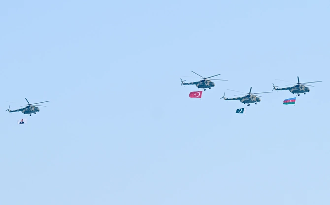 Azərbaycan, Türkiyə və Pakistan respublikalarının Dövlət bayraqlarını daşıyan "Mİ-17" döyüş-nəqliyyat helikopterləri üçlüyünə Vətən Müharibəsi qəhrəmanları – Hərbi Hava Qüvvələrinin komandanı general-leytenant Namiq İslamzadə və polkovnik Rəşad Nadirov başçılıq edirdi. "Qarabağ" ordenli general-mayor Zaur Rüstəmovun başçılığı ilə "Mİ-17" helikopteri isə Ümummilli Lider Heydər Əliyevin portretini nümayiş etdirdi.