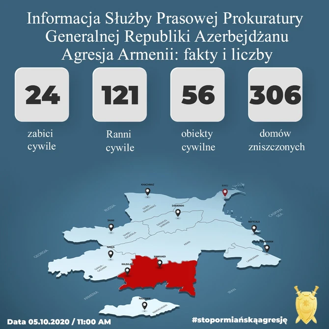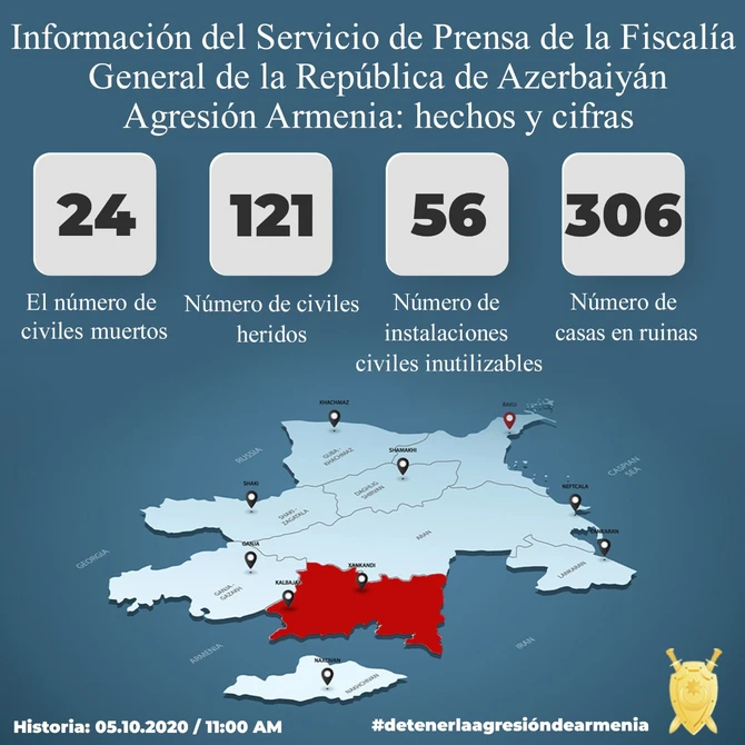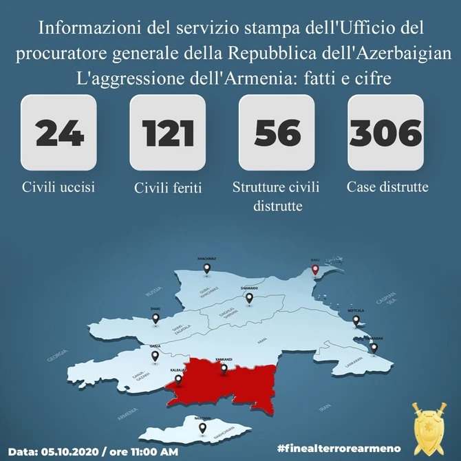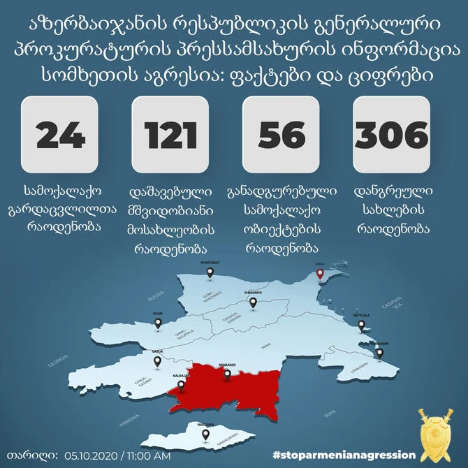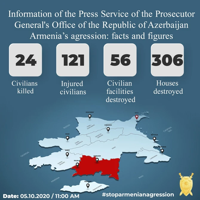 Baş Prokurorluğun mətbuat xidmətindən BAKU.WS-ə verilən məlumata görə, sentyabrın 27-dən hazırkı vaxtadək ermənilərin yaşayış məntəqələrini atəşə tutması nəticəsində 24 mülki şəxs həlak olub, 121 nəfər yaralanıb.