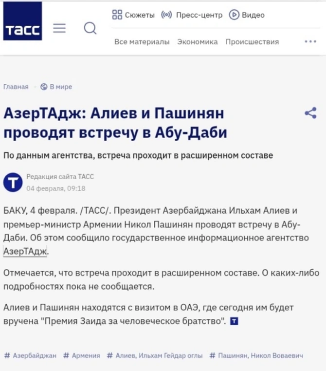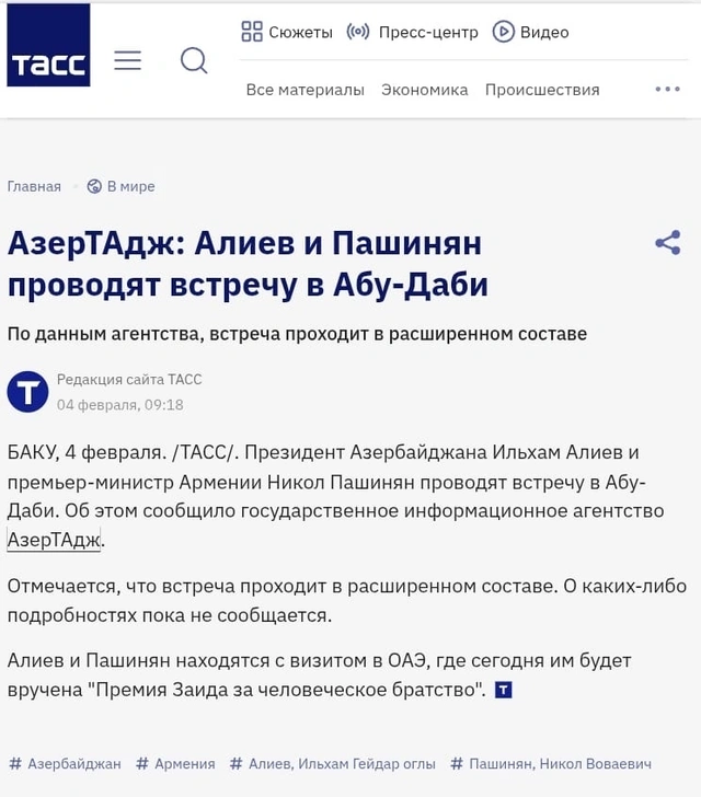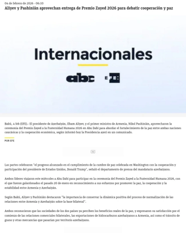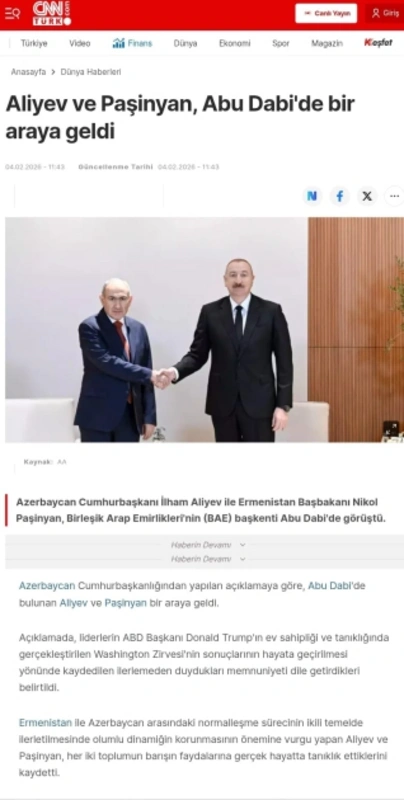 Həmçinin bildirilib ki, Azərbaycan Prezidenti İlham Əliyev və Ermənistanın Baş naziri Nikol Paşinyan fevralın 4-də Birləşmiş Ərəb Əmirliklərinin paytaxtı Əbu-Dabidə 2026-cı il "Zayed İnsan Qardaşlığı Mükafatı"nın təqdimolunma mərasimində iştirak ediblər. Mükafat bu il hər iki liderə təqdim olunub.