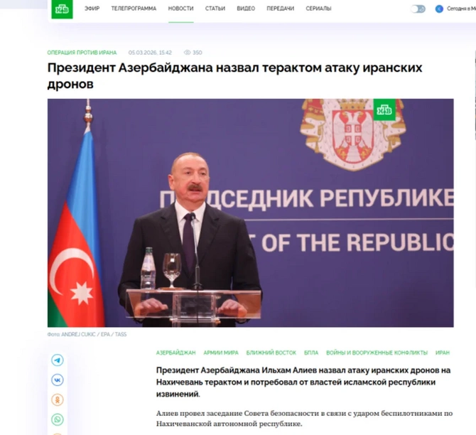 Rusiyanın NTV, RTR, RT telekanallarının saytında yerləşdirilən videomateriallarda da Azərbaycan Prezidenti İlham Əliyevin Naxçıvana dron hücumu ilə bağlı fikirləri yer alıb. Materiallarda vurğulanıb ki, dövlət başçısı ölkəsinin İrana qarşı müharibə ilə bağlı mövqeyini ifadə edərək deyib: