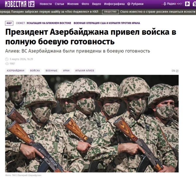 "İzvestiya" qəzetinin "İlham Əliyev qoşunların döyüş hazırlığı vəziyyətinə gətirilməsi əmrini verib" sərlövhəli məqaləsində bildirilir ki, İran ərazisindən Azərbaycanın Naxçıvan bölgəsinə dron hücumu ilə bağlı Təhlükəsizlik Şurasının iclasını keçirən Azərbaycan Prezidenti deyib: