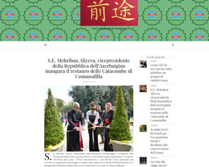 İtaliyanın "Eurasiaticanews" portalının materialında isə Azərbaycanın Birinci vitse-prezidentinin oktyabrın 16-da Müqəddəs Kommodilla katakombalarının bərpası layihəsinin açılış mərasimində iştirak etdiyi və həyata keçirilmiş bərpa işləri ilə tanış olduğu bildirilib. Qeyd olunub ki, mərasimdə Vatikanın Müqəddəs Arxeologiya üzrə Pontifik Komissiyasının prezidenti Monsenyor Paskuale Yakobone, Mədəniyyət və Müqəddəs Arxeologiya üzrə Pontifik Komissiyasının sabiq prezidenti kardinal Canfranko Ravazi və Roma şəhərinin VIII bələdiyyəsinin prezidenti Amedeo Çakkeri də iştirak edib.