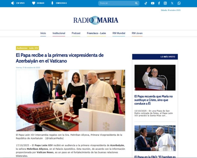 Argentinanın "Radio María" xəbər və onlayn radio portalı da Mehriban Əliyeva Papa XIV Leonun görüşünü diqqətdə saxlayıb. Qeyd olunub ki, bu görüş Vatikan ilə Azərbaycan arasında yaxşı ikitərəfli münasibətlərin möhkəmləndirilməsi yolunda mühüm bir addımdır.