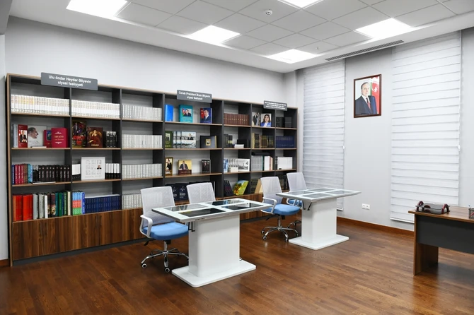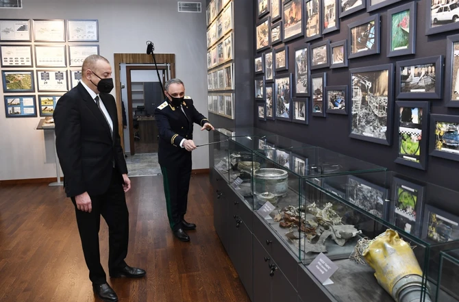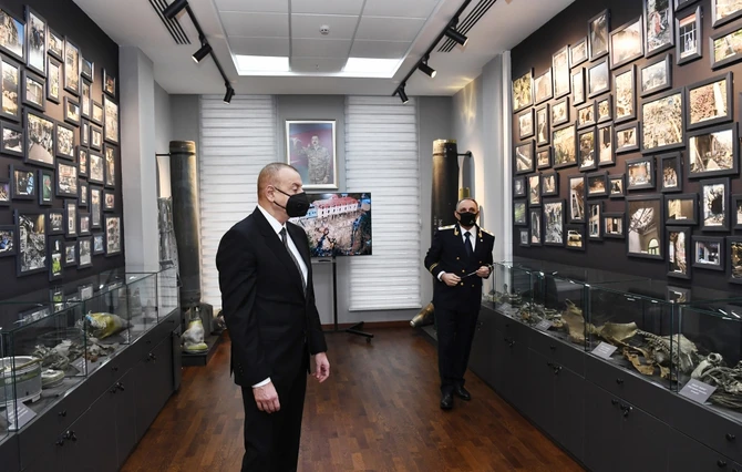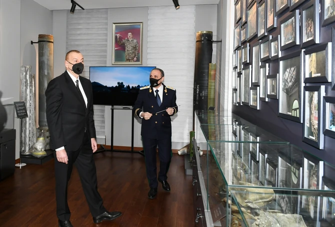 Prezident İlham Əliyev kompleksin inzibati binasında yaradılan və 44 günlük Vətən müharibəsinə həsr edilmiş tarixi-memorial qalereya ilə tanış oldu. Qalereyada Vətən müharibəsi dövründə Ermənistan ordusunun Gəncə, Tərtər, Bərdə şəhərlərində mülki əhaliyə və obyektlərə qarşı törətdiyi terror aktları ilə bağlı maddi sübutlar toplanıb.
