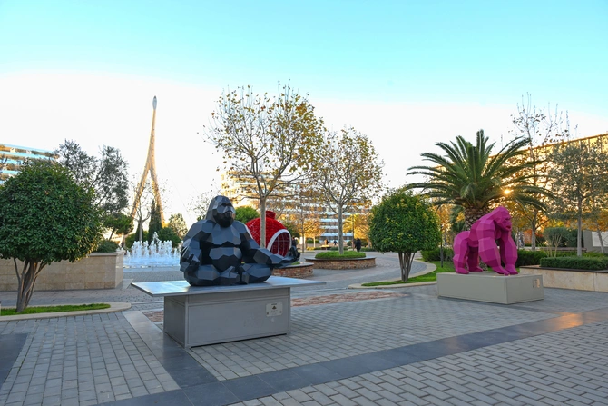 Prezident İlham Əliyev, birinci xanım Mehriban Əliyeva və qızları əvvəlcə "Qarabağ atları" heykəltaraşlıq kompleksi ilə tanış oldular. Vətən müharibəsindəki Qələbəmizə həsr edilmiş və milli irsimizin rəmzi olan bu kompleks "Qarabağ atları" meydanında ucaldılıb. Kompleksdə "Soltan", "Ürək", "Sereyin", "Aypara", "Şöhrət", "Ötqəm" və "İldırım" adlı ümumilikdə 7 Qarabağ atının heykəli var.