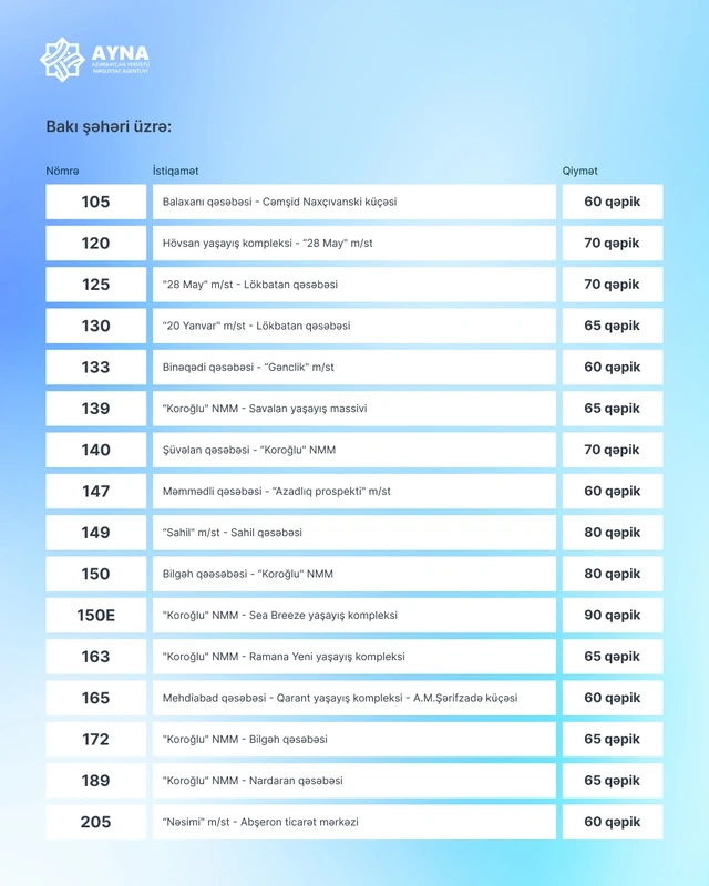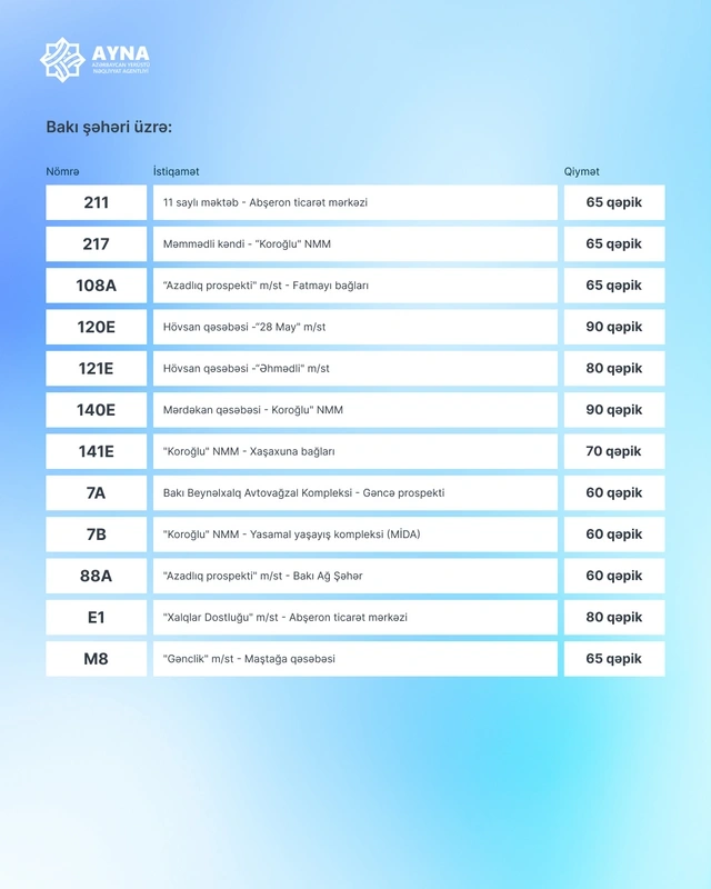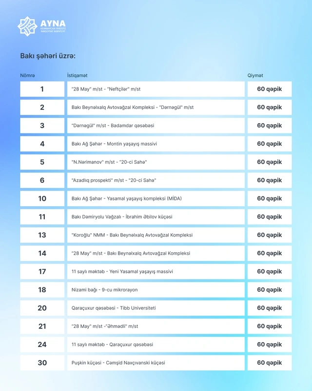 Напомним, что 29 сентября коллегия Министерства цифрового развития и транспорта Азербайджана утвердила новые тарифы на пассажирские перевозки в автобусах и метро. Согласно решению, на регулярных городских (внутрирайонных), пригородных и межпоселковых маршрутах, работающих исключительно с безналичной оплатой и соответствующих современным требованиям, минимальный тариф на проезд (в зависимости от расстояния) установлен на уровне 60 гяпиков. Решение вступило в силу 1 октября.