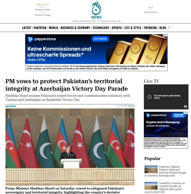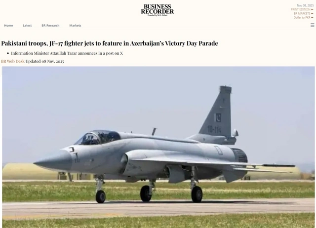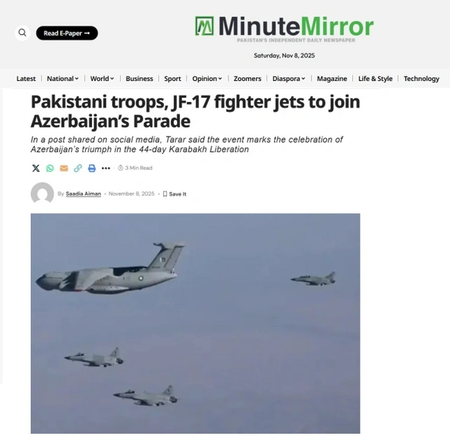 Ведущие средства массовой информации Пакистана, включая ARN News Centre, AAJ News (AAJ TV), The Express Tribune, Brecorder, Geo News, 24 Ne3ws HD и Minute Mirror, в своих публикациях сообщили о масштабности военного парада, совместном участии вооруженных сил Азербайджана, Турции и Пакистана, а также о продемонстрированной военной технике и авиации. Особое внимание было уделено выступлению Президента Азербайджанской Республики, широко освещались высказывания главы нашего государства о решительной поддержке, оказанной Турцией и Пакистаном Азербайджану в период Отечественной войны. Также отмечалось, что Президент Ильхам Алиев выразил благодарность Пакистану за оказанную твердую поддержку в справедливой борьбе Азербайджана и высоко оценил роль официального Исламабада в обеспечении региональной стабильности в Южной Азии. В публикациях особо подчеркивалось участие в параде премьер-министра Пакистана Мухаммада Шахбаза Шарифа, внимание было обращено на тесное сотрудничество армий трех братских стран. Отмечалось также, что пакистанские СМИ вынесли на первый план значение парада с точки зрения укрепления регионального сотрудничества и упрочения мира и стабильности на Южном Кавказе. В этом контексте издание The Express Tribune особо отметило высказывание премьер-министра Пакистана на военном параде относительно дружбы и региональной солидарности.