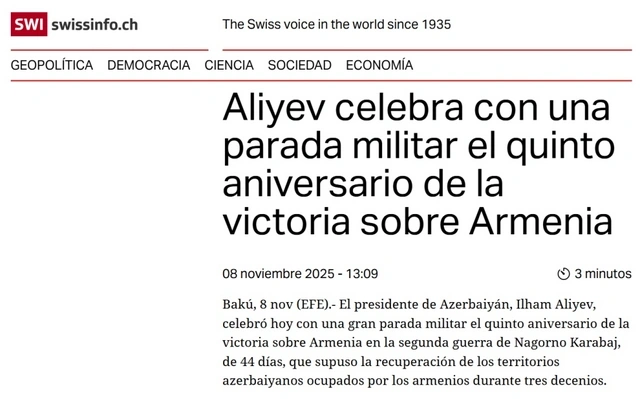 Испанское агентство EFE также уделило особое внимание военному параду. В опубликованной агентством информации особо подчеркивается участие лидеров Турции и Пакистана в военном параде, посвященном пятой годовщине Победы во второй Карабахской войне. В информации, в частности, приведены высказывания президентов Азербайджана и Турции, Премьер-министра Пакистана, а также мнения лидеров о том, что Победа Азербайджана открыла новую страницу для мира, развития и безопасности в регионе. Эту новость также опубликовало швейцарское издание Swissinfo.ch со ссылкой на EFE.