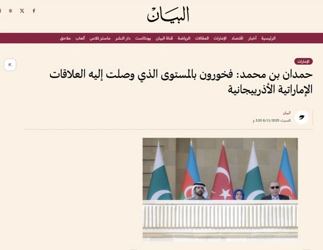 Ведущие средства массовой информации Объединенных Арабских Эмиратов, в том числе порталы UAE BARQ, Emarat Al Youm, Al Bayan, Sharjah24 и 20Four, также широко осветили военный парад, посвященный пятой годовщине Победы в Отечественной войне. В сообщениях подробно рассказывалось о масштабности парада, продемонстрированной военной технике и военной мощи Азербайджанской армии. Особое внимание было уделено высказываниям Президента Азербайджанской Республики Ильхама Алиева, президента Турции Реджепа Тайипа Эрдогана и премьер-министра Пакистана Мухаммада Шахбаза Шарифа, прозвучавшим в ходе парада. В материалах также нашли отражение заявления лидеров Азербайджана и Турции о региональном сотрудничестве и обеспечении мира и стабильности на Южном Кавказе.