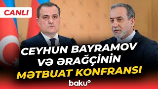 Министр иностранных дел Азербайджанской Республики Джейхун Байрамов и его иранский коллега Сейид Аббас Арагчи принимают участие в пресс-конференции.