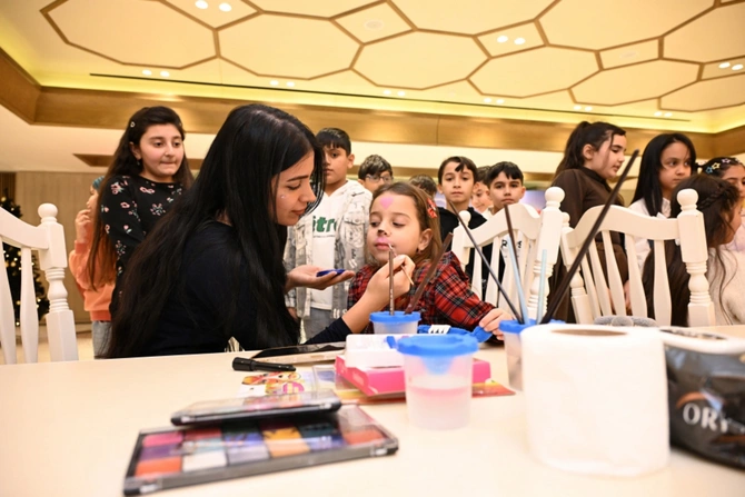 Во дворце "Гюлистан", украшенном в праздничной атмосфере, детей встречали сказочные персонажи. С помощью face art дети также получили возможность перевоплотиться в любимых сказочных героев и персонажей.