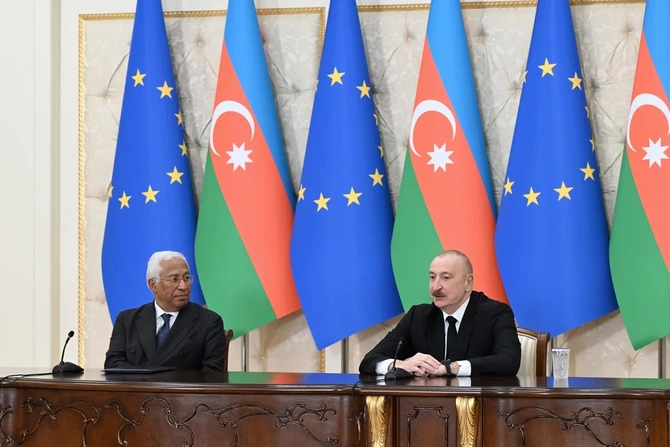 Президент Азербайджанской Республики Ильхам Алиев и президент Совета Европейского союза Антониу Кошта выступают с заявлениями для прессы.