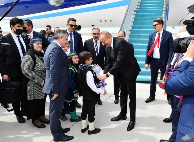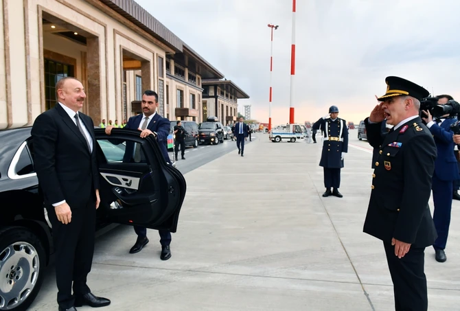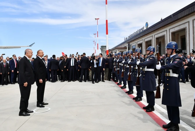В аэропорту Ризе-Артвин, где развевались государственные флаги двух стран, в честь Президента Азербайджана был выстроен почетный караул.