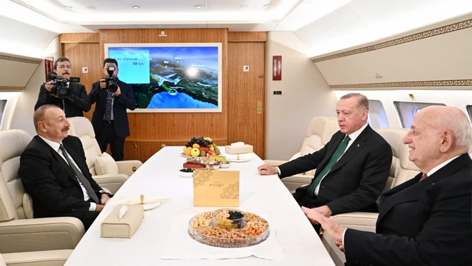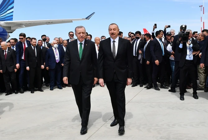 Мы и сегодня вместе, сообща, плечом к плечу трудимся в деле восстановления Карабаха. Восстановительной работой в Карабахе занимаются многие турецкие компании, в том числе компания, построившая этот прекрасный аэропорт, который называют чудом. Тысячи наших турецких братьев сегодня работают в Азербайджане, участвуя в деле восстановления Карабаха.