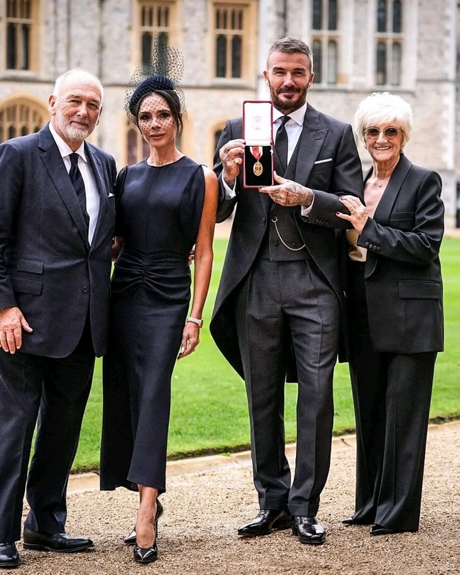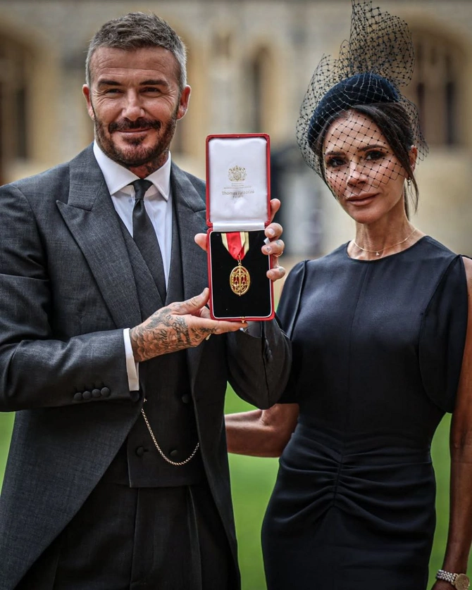 На церемонию 50-летний Бекхэм прибыл в Виндзорский замок в костюме, сшитом по эскизам его супруги Виктории. Напомним, она была удостоена звания Офицера Ордена Британской империи в 2017 году за вклад в индустрию моды.