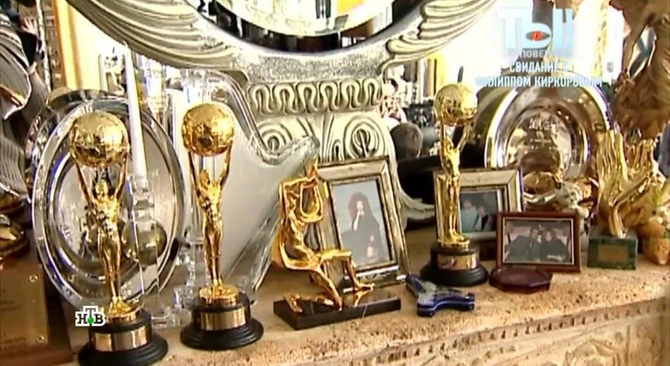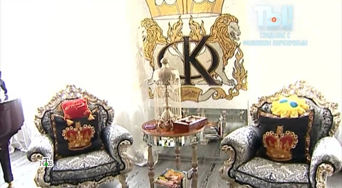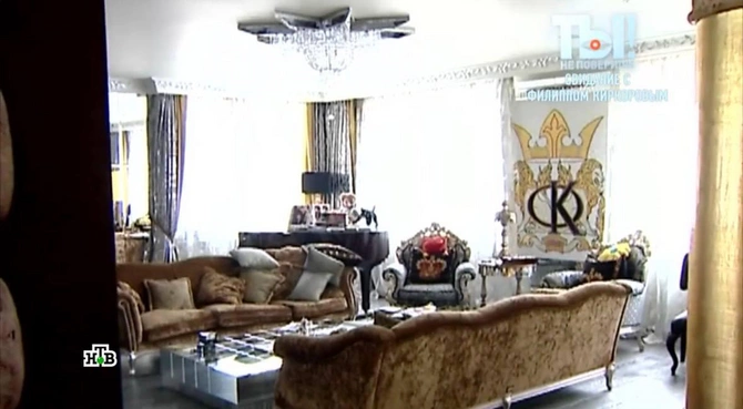 Mənzil həm də teatr səhnəsini xatırladır. Divarlardan birində isə Kirkorovun baş hərfləri əks olunan xalça var. Çilçıraqlar və sütunlar isə ümumi saray dəbdəbəsini gücləndirir.