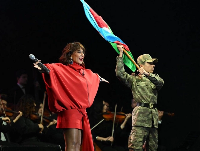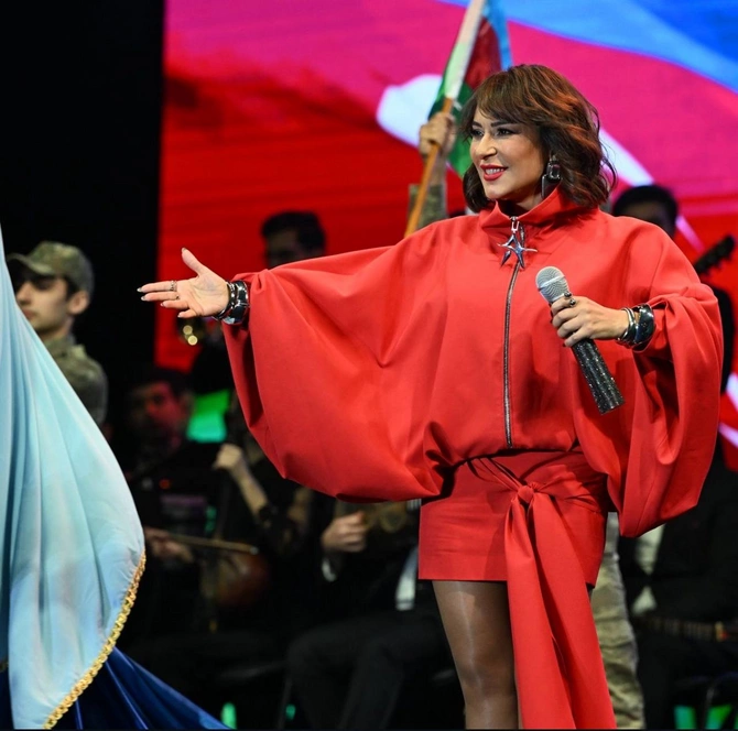 BAKU.WS xəbər verir ki, sənətçi Bulvar ərazisində keçirilən möhtəm konsertdə çıxış edib. Qırmızılara bürünən sənətçi "Gözün aydın olsun, Qarabağ" əsərini səsləndirib. Füsunkar görünən sevilən ulduzu səhnədə rəqqaslar müşayiət edib.
