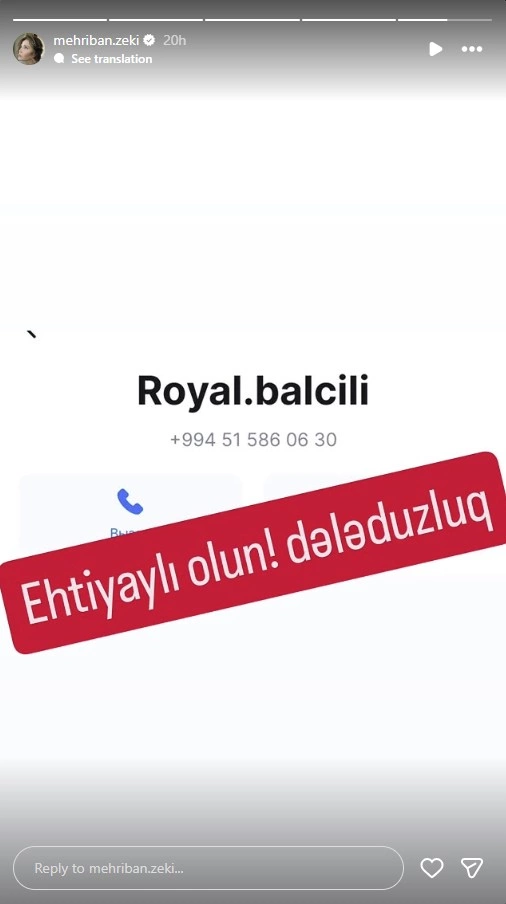 Aktrisa qeyd edib ki, özünü "Kapital bank"ın əməkdaşı kimi təqdim edən şəxs ondan kartının kodunu istəyib. Lakin Mehriban Zəki bunu dələduzluq olduğunu bildib və kartının nömrəsini verməyib: