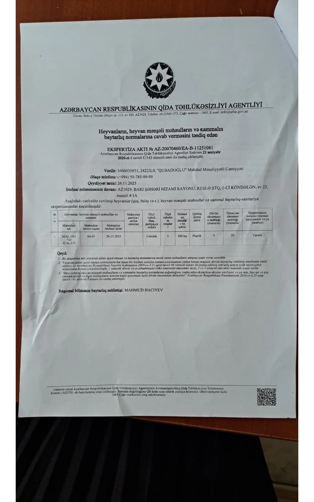 Eyni zamanda qida blokuna baxış zamanı məhsulların temperatur rejiminə, mal qonşuluğuna və istifadəyə yararlılıq müddətlərinə əməl edildiyi, istehlaka təqdim edilən çiy mal ətindən götürülmüş nümunələrin laborator müayinəsi nəticəsində isə hər hansı uyğunsuzluq olmadığı müəyyənləşib".