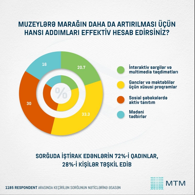Respondentlərin fikrincə, muzeylərə marağın artırılması üçün ən effektiv addımlar gənclər və məktəblilər üçün xüsusi proqramların təşkili, sosial şəbəkələrdə aktiv tanıtım və interaktiv sərgilərin keçirilməsidir.