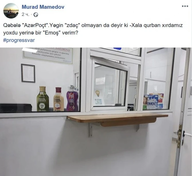 Qəbələdə "AzərPoçt"un filialında profilə uyğun olmayan mal satırlar.BAKU.WS xəbər verir ki, poçtda şampun, yuyucu toz satılır.Murad Mamedov adlı “Facebook” istifadəçisi yazıb ki, oradan mal alan müştərilərə pulun qalığı da verilmir.