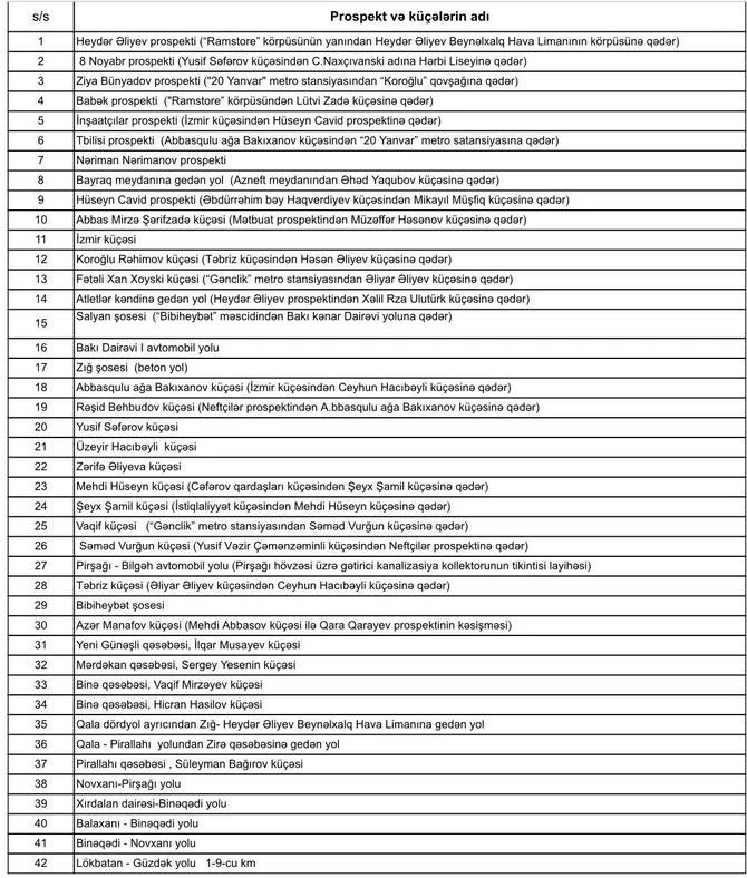 Təmir aparılacaq küçə və yolların siyahısı: