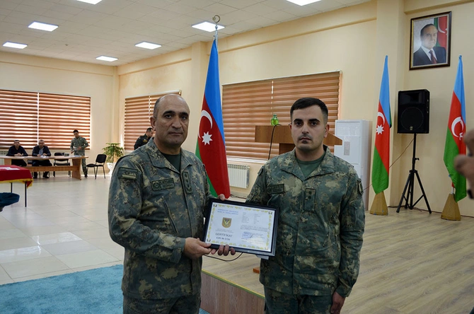 Sonra məzunlara sertifikatlar təqdim olunub, kurs birincisi leytenant Rahidə Şahverdiyeva tərəfindən yaş kötüyünə rəmzi emblem vurulub.