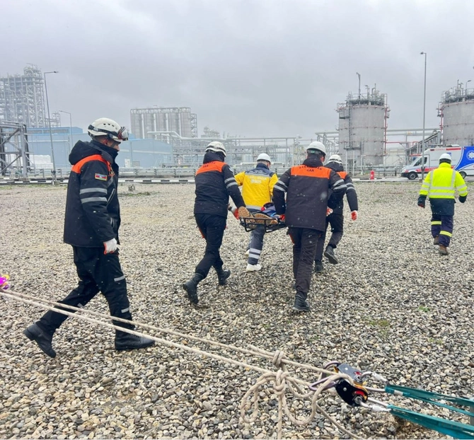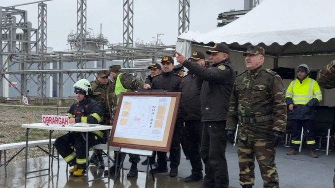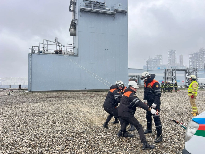 Təlim zamanı Polipropilen və Yüksəksıxlıqlı Polietilen zavodunda baş vermiş şərti yanğın yerinə operativ çatan FHN-in yanğın-xilasetmə qüvvələri tərəfindən işçilərin "təhlükəli ərazidən" təxliyə edilməsi, "yanğın" yerində çevik kəşfiyyatın aparılması və "yanğının söndürülməsi", "yaralıların xilas edilməsi" əməliyyatları yerinə yetirilib.