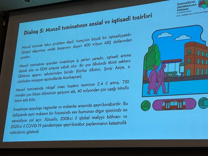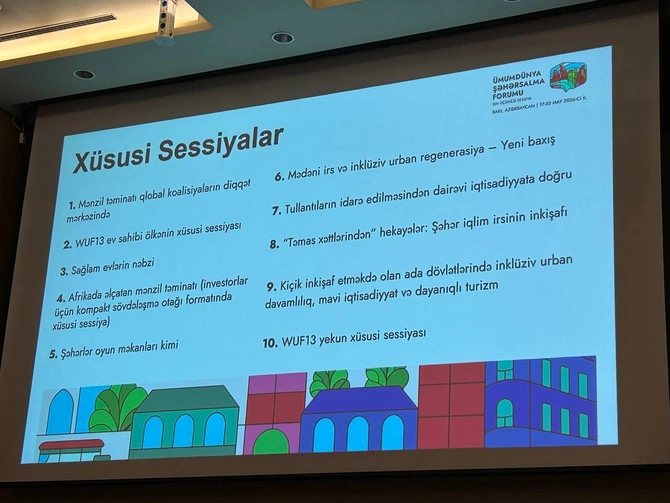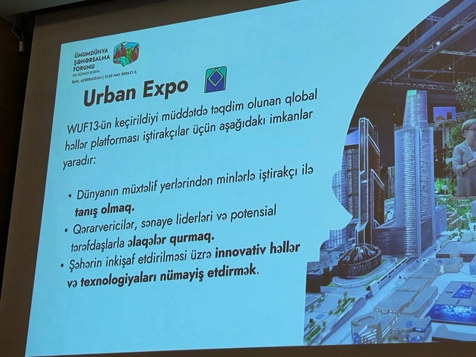 Daha sonra BMT-nin Məskunlaşma Proqramının (UN-Habitat) Azərbaycan üzrə rəhbəri Anna Soave qeyd edib ki, 2026-cı ilin ölkədə "Şəhərsalma və Memarlıq İli" elan olunması və WUF13 tədbirinin Azərbaycanda təşkili beynəlxalq diqqətin regiona yönəlməsinə və konkret, davamlı nəticələrin əldə edilməsinə unikal imkan yaradır. Onun sözlərinə görə, əsas məqsəd forumun nəticələrini milli təcrübəyə inteqrasiya etmək, institusional mexanizmləri gücləndirmək, mütəxəssislərin bacarıqlarını inkişaf etdirmək, uzunmüddətli tərəfdaşlıqlar qurmaq və insanyönümlü şəhərsalma yanaşmasını təşviq etməkdir. Anna Soave, həmçinin vurğulayıb ki, tədbirdə aparılacaq müzakirələr layiqli mənzil təminatı, mobillik, əlçatanlıq, ekoloji dayanıqlılıq və inklüziv şəhərsalma istiqamətlərində irəliləyişlərə təkan verəcək. O, bu prosesdə medianın əhəmiyyətli rol oynadığını diqqətə çatdırıb.