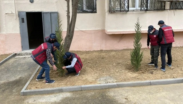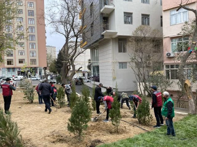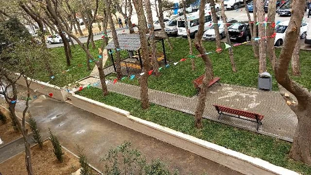 Binanın həyətinə 1200 kv m asfalt örtüyü, 120 kv m tamet, 800 kv m qazon vurulub, 300 p m yeni bardürlər qoyulub, 100 p m istinad divarı və pilləkən təmir olunub, yaşıllıqların suvarılması üçün 120 p m su xətti çəkilib, mövcud yaşıllıqlar bərpa edilərək ağaclar budanıb, müxtəlif növ həmişəyaşıl ağaclar və kollar əkilib.