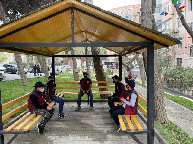 Sakinlərin asudə vaxtlarının səmərəli təşkili üçün binanın həyətinə söhbətgah və oturacaqlar qoyulub.