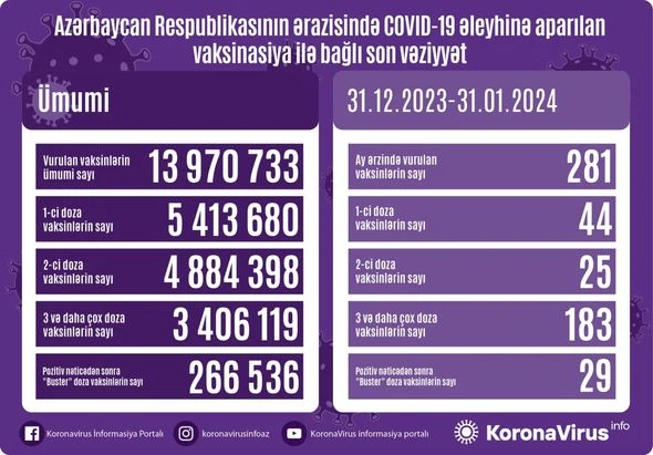 Azərbaycanda son bir ayda (31.12.2023-31.01.2024) koronavirus (COVID-19) əleyhinə 281 vaksin vurulub.