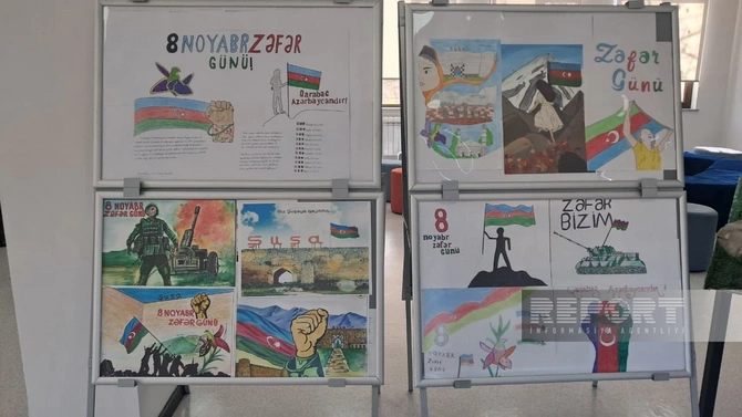 Məktəbin dəhlizində şagirdlərin Zəfər Gününü əks etdirən əl işləri və rəsm əsərləri sərgilənir. Tədbir çərçivəsində məktəblilərin Zəfərə həsr etdikləri şeir kompozisiyası, rəqs və musiqi nömrələri də təqdim olunacaq.