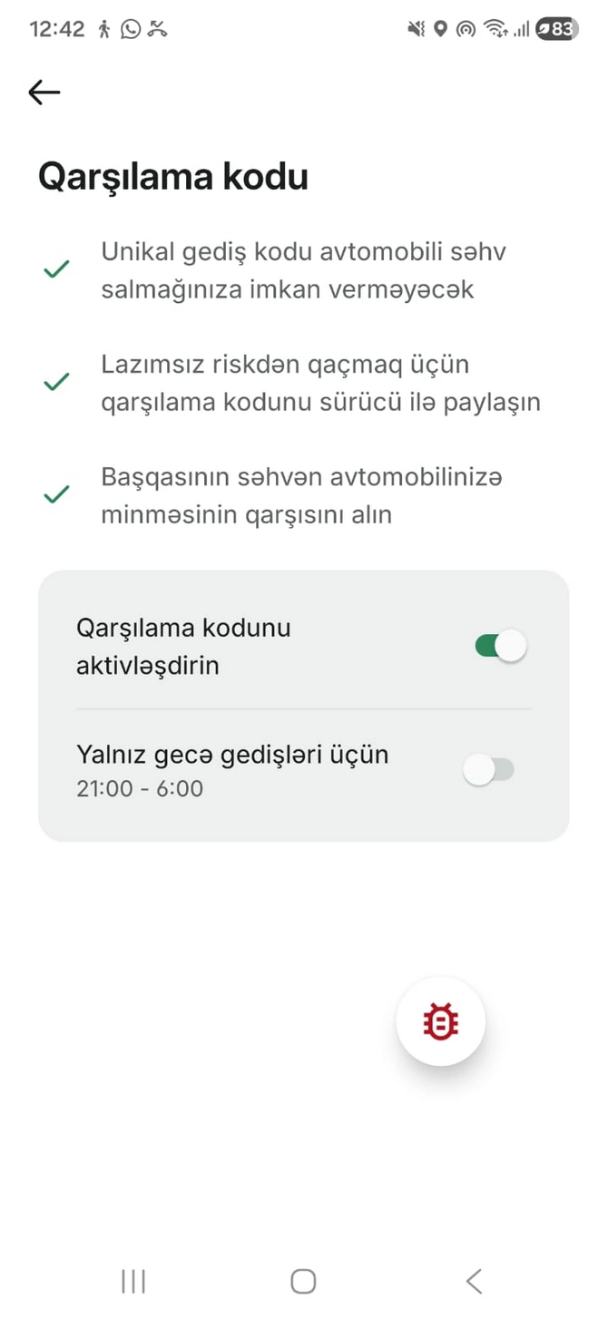 - Daha təhlükəsiz səfər üçün tətbiqdə "Təhlükəsizlik" bölmısində mövcud olan Pickup code (Gedişin təsdiq kodu) funksiyasını aktivləşdirə bilərsiniz. Bu halda səfər yalnız kodu sürücüyə təqdim etdikdən sonra başlayır.