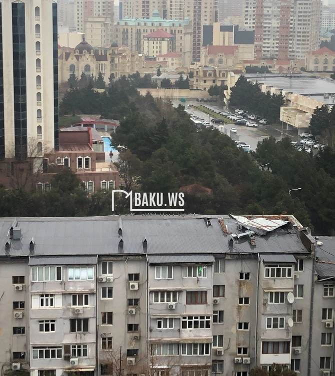 Məlumata görə, sözügedən hal "Europe" hotelə qz-üzə yerləşən binada baş verib. Bildirilib ki, küləyin təsirindən dam örtüyünün bəzi hissələri qoparaq damın üzərində qalıb. Növbəti dəfə güclü külək əsəcəyi təqdirdə qopan hissə sakinlərin başına düşə bilər.